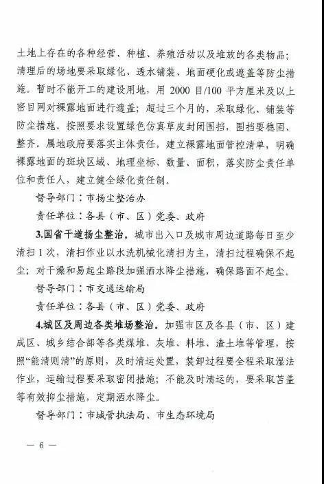 4.城區(qū)及周邊各類堆場整治。加強市區(qū)及各縣(市、區(qū))建成區(qū)、城鄉(xiāng)結合部等各類煤堆、灰堆、料堆、渣土堆等管理,按照“能清則清''的原則,及時清運處置,裝卸過程要全程采取濕法作業(yè),運輸過程要采取密閉措施;不能及時清運的,要采取苫蓋等有效抑塵措施,定期灑水降塵。
