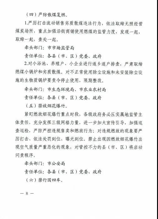 (三)緊盯問題,嚴懲重罰。各地要緊目丁不落實管控措施的企業(yè),務必按照“處罰、移交、行拘、問責、曝光”五個到位從嚴從快處理;所有露天焚燒、違規(guī)燃放煙花爆竹的問題務必做到處罰和移交到位;《唐山市大氣污染防治若干規(guī)定》有明確罰則的,要堅持就高不就低、高線頂格處理;公安部門對于移交的案件,依法從快查處,務必追究企業(yè)負責人法律責任,嚴肅刑責治污,形成依法打擊的高壓態(tài)勢。