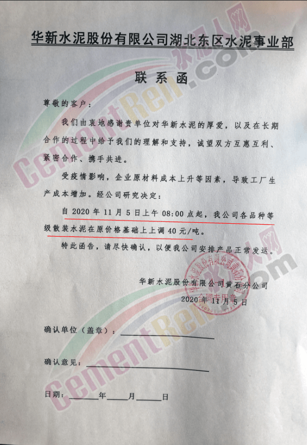 華新水泥湖北東區(qū)水泥事業(yè)部鄂州公司、黃石分公司、大冶公司聯(lián)系函稱(chēng),受疫情影響,企業(yè)原材料成本上升等因素,導(dǎo)致工作生產(chǎn)成本增加,經(jīng)公司研究決定 ,自11月5日上午8時(shí)起,公司各品種等級(jí)散裝水泥在原價(jià)基礎(chǔ)上上調(diào)40元/噸。