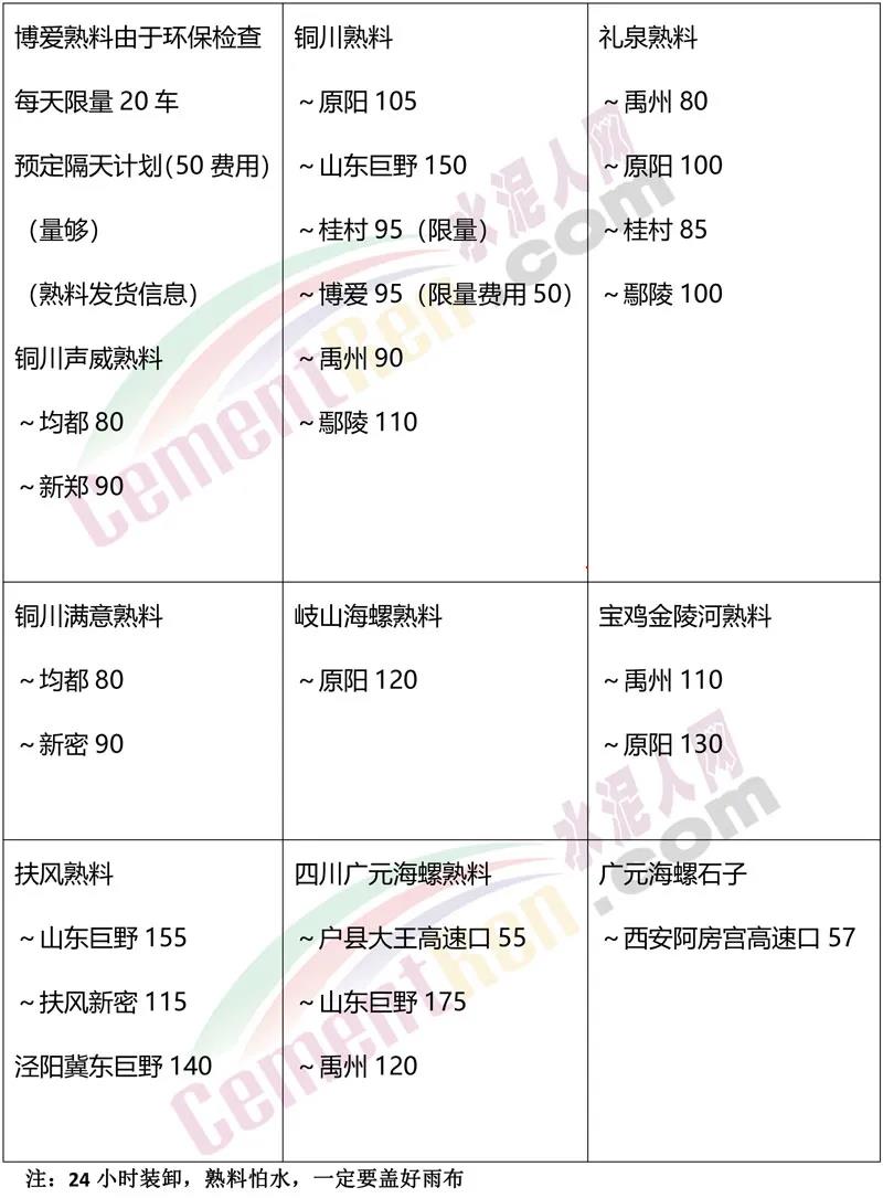 自去年四季度河南區(qū)域經(jīng)銷(xiāo)商將山西熟料“拉空”后,跨省到陜西采購(gòu)以來(lái),關(guān)中區(qū)域就一直有熟料供應(yīng)河南區(qū)域。而且不僅銅川聲威建材,海螺、冀東、堯柏以及四川廣元區(qū)域均有熟料和水泥經(jīng)由貿(mào)易商轉(zhuǎn)售到河南多區(qū)域。從貿(mào)易商近期發(fā)布相關(guān)信息可見(jiàn),熟料從陜西區(qū)域運(yùn)至河南區(qū)域運(yùn)費(fèi)約在80~100元左右,到達(dá)山東荷澤區(qū)域運(yùn)費(fèi)在120~155元左右。且通知因環(huán)保管控每天限量20車(chē),需提前以現(xiàn)金預(yù)定。