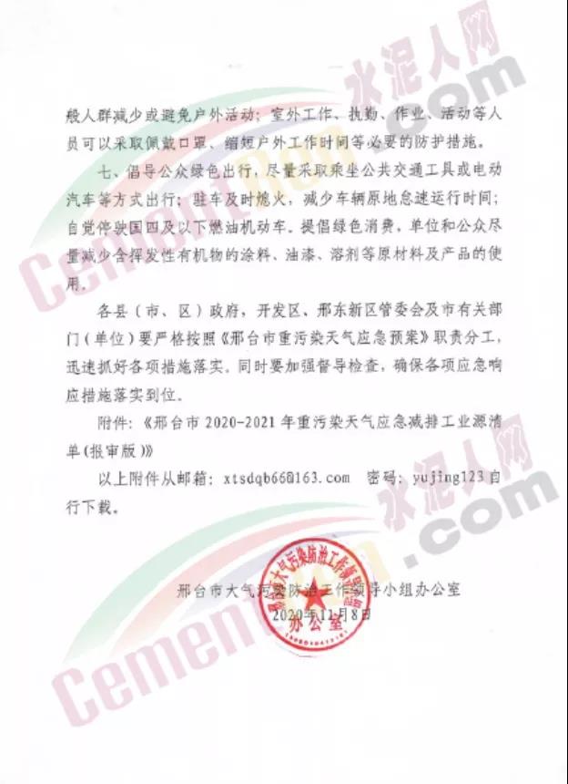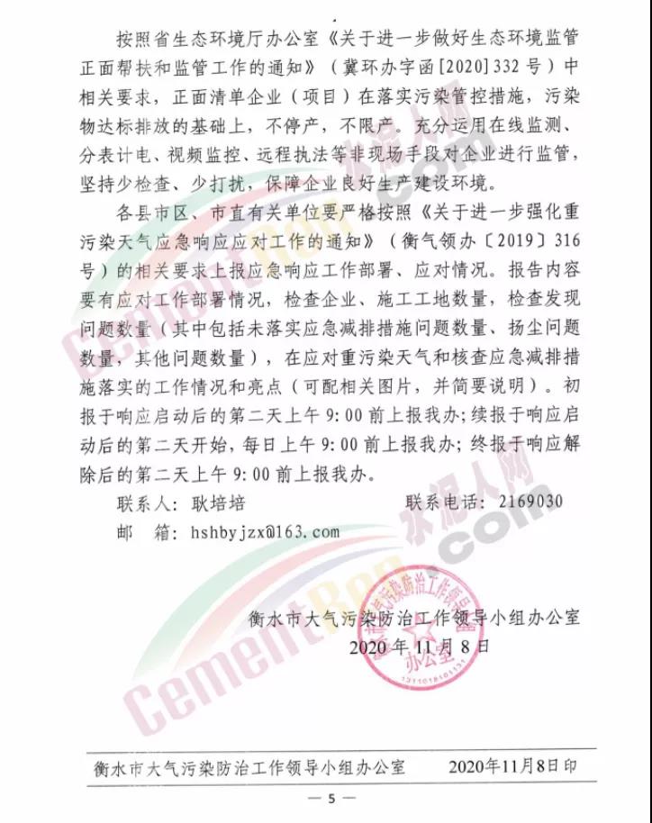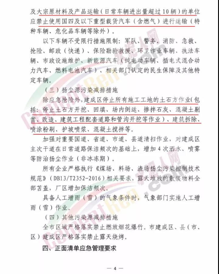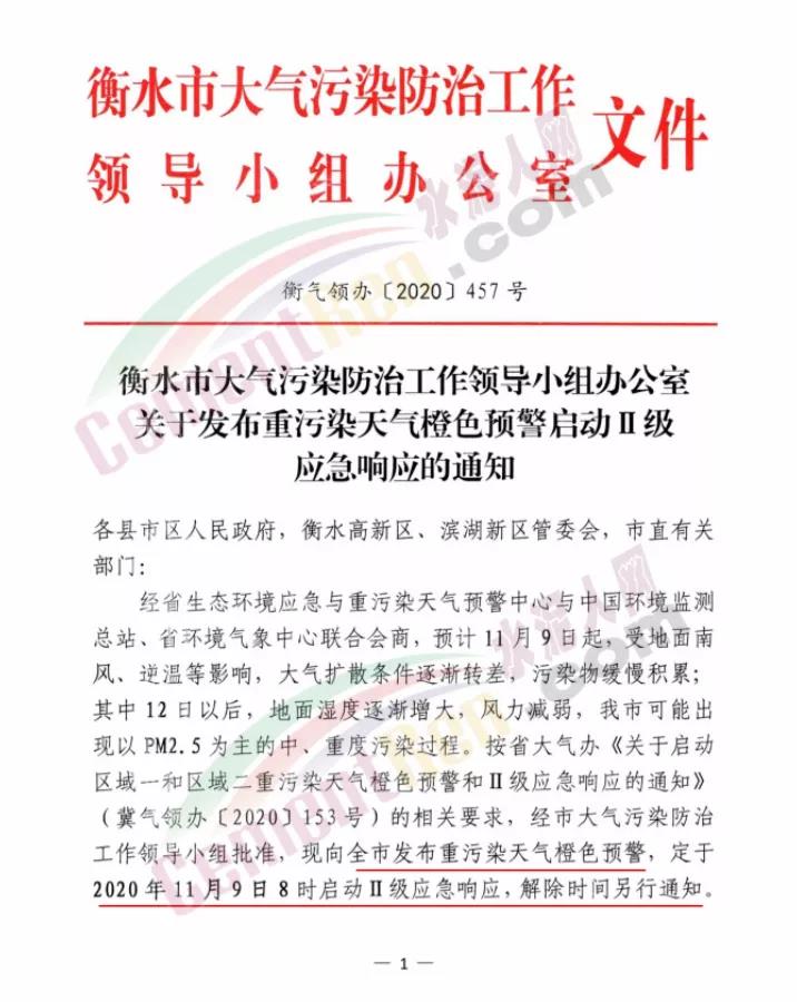 衡水市大氣污染防治工作領(lǐng)導(dǎo)小組辦公室發(fā)文:定于2020年11月9日8時(shí)啟動(dòng)Ⅱ級(jí)應(yīng)急響應(yīng),解除時(shí)間另行通知。工業(yè)企業(yè)嚴(yán)格按照《2020-2021年衡水市工業(yè)企業(yè)應(yīng)急減排清單(報(bào)審版)》的清單中橙色預(yù)警減排措施執(zhí)行。除應(yīng)急搶險(xiǎn)外,建成區(qū)停止所有施工工地的土石方作業(yè)(包括:停止土石方開挖、回填、場(chǎng)內(nèi)倒運(yùn)、摻拌石灰、混凝土剔鑿、改造、建筑工程配套道路和管溝開挖等作業(yè))、建筑拆除、噴涂粉刷、護(hù)坡噴漿、混凝土攪拌等。