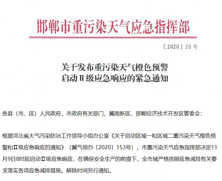 邯鄲市11月9日8時(shí)起啟動(dòng)Ⅱ級(jí)應(yīng)急響應(yīng),解除時(shí)間另行通知