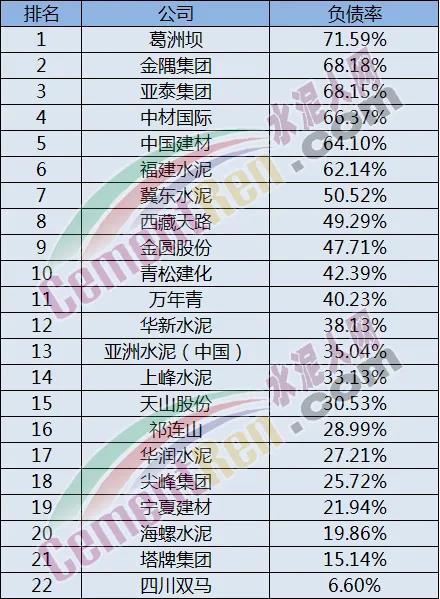 負(fù)債率往往也是觀測(cè)一個(gè)企業(yè)發(fā)展與活力的重要數(shù)據(jù),負(fù)債率太高或者太低,對(duì)于企業(yè)來(lái)說(shuō)都不是一個(gè)好苗頭。排名整體看來(lái)大部分企業(yè)的負(fù)債率都在正常范圍內(nèi),除了第一名的葛洲壩,負(fù)債率達(dá)到了71.59%;第二名的金隅集團(tuán)與第三名的亞泰集團(tuán)負(fù)債率分別達(dá)到了68.18%和68.15%,第四名中材國(guó)際為66.37%,第五名中國(guó)建材為64.10%,海螺水泥處于倒數(shù)第三名,有19.86%的負(fù)債率,塔牌集團(tuán)倒數(shù)第二為15.14%,四川雙馬是最后一名,負(fù)債率低至6.6%。