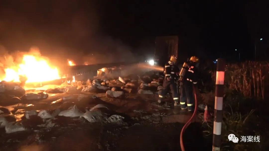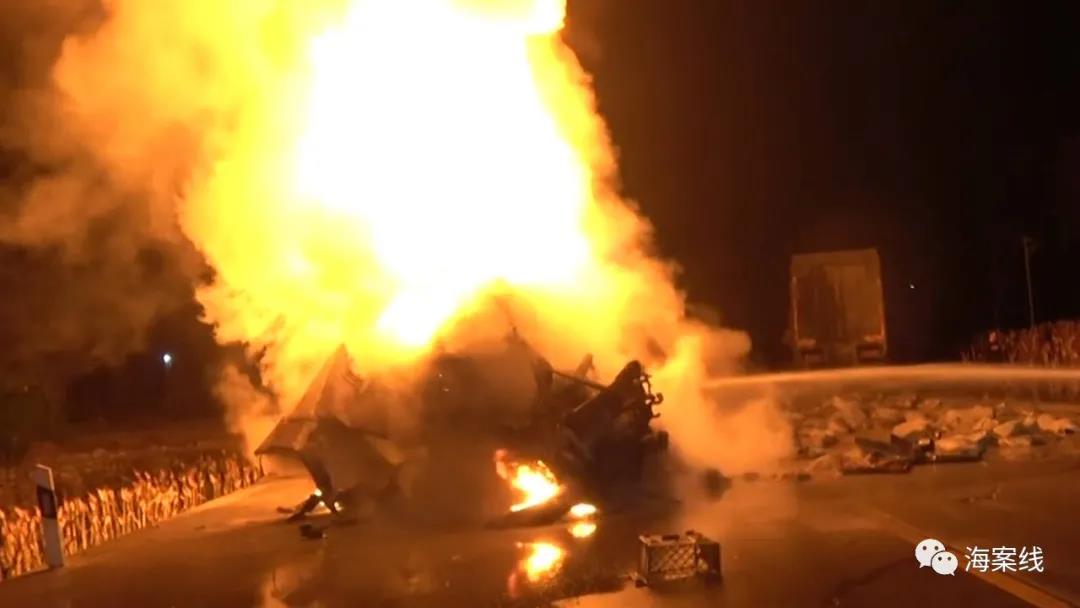 當(dāng)天凌晨2點(diǎn)51分,都安安陽(yáng)消防救援站接到警情后,立即趕赴現(xiàn)場(chǎng)救援。在事故現(xiàn)場(chǎng),一輛運(yùn)載水泥的掛車(chē)與一輛運(yùn)載化肥的貨車(chē)迎面相撞,水泥掛車(chē)燃起熊熊大火,兩人被困火中無(wú)法逃生;運(yùn)化肥的貨車(chē)則是側(cè)翻在一旁,車(chē)頭已嚴(yán)重變形,一人被困駕駛室內(nèi),情況十分緊急。