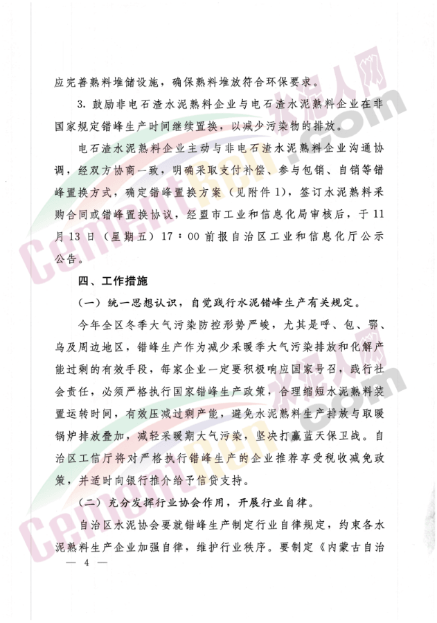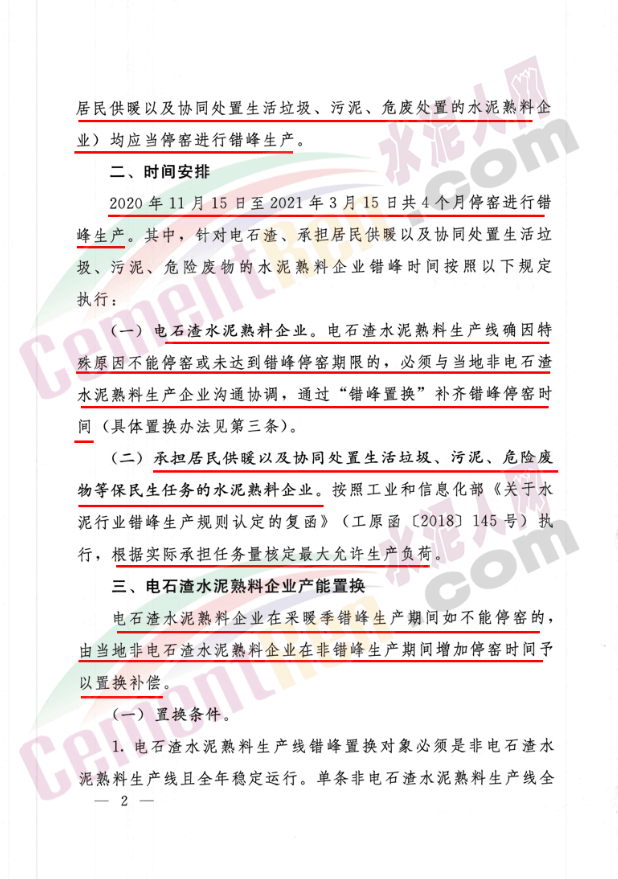 承擔居民供暖及協(xié)同處置生活垃圾、污泥、危險廢物等保民生任務(wù)的水泥熟料企業(yè),按照工業(yè)和信息化部《關(guān)于水泥行業(yè)錯峰生產(chǎn)規(guī)則認定的復(fù)函》(工原函[2018]145號)執(zhí)行,根據(jù)實際承擔任務(wù)量核定最大允許生產(chǎn)負荷。