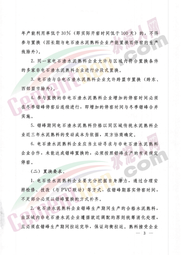 五、電石渣水泥熟料企業(yè)應(yīng)當主動尋求與非電石渣水泥熟料企業(yè)合作,未能達成錯峰置換的,必須按照錯峰生產(chǎn)的有關(guān)規(guī)定停窯。
