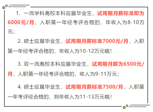 普通本科試用期4500元-6000元/月;試用期3-6個月,期滿考評定崗后,以崗定薪,享受年終獎勵,年收入約7-12萬元,每年根據(jù)業(yè)績表現(xiàn)進(jìn)行調(diào)薪。