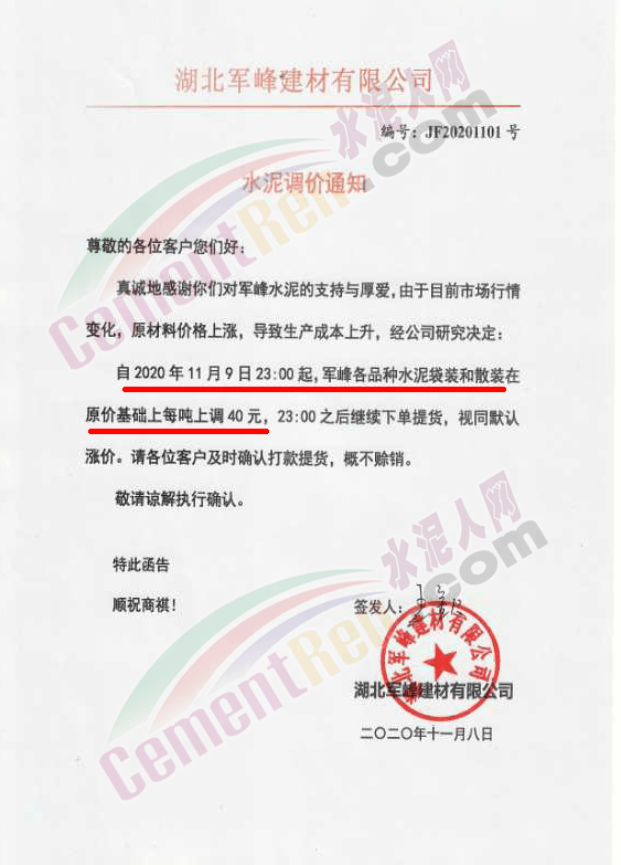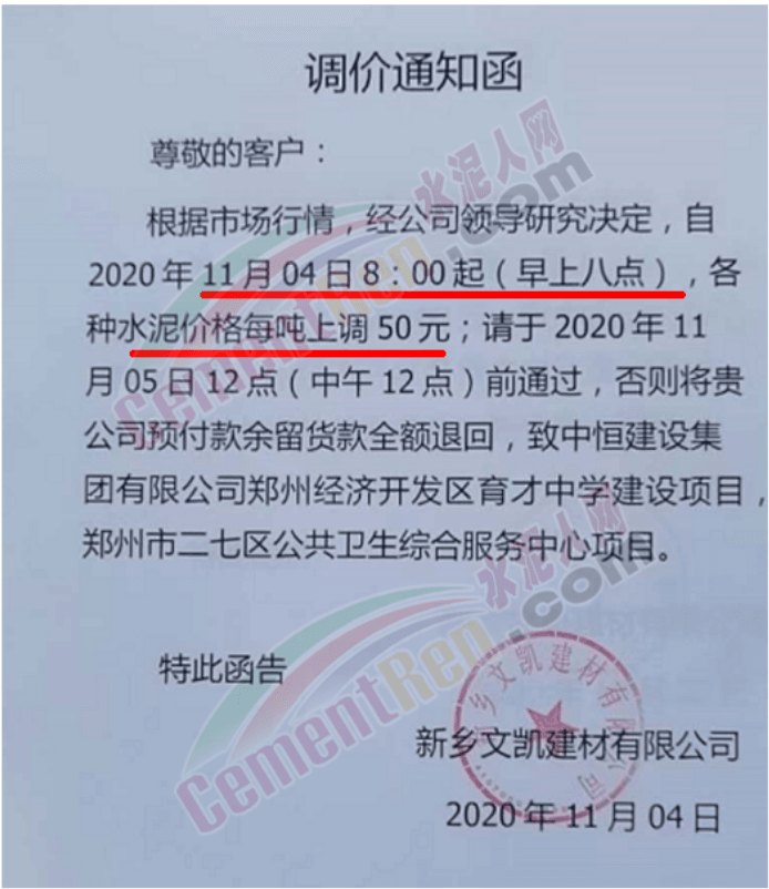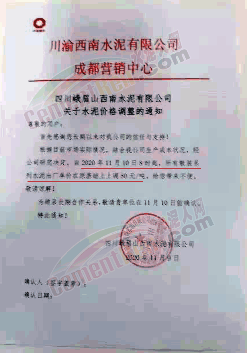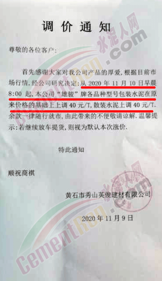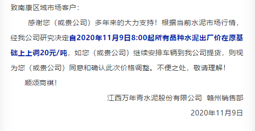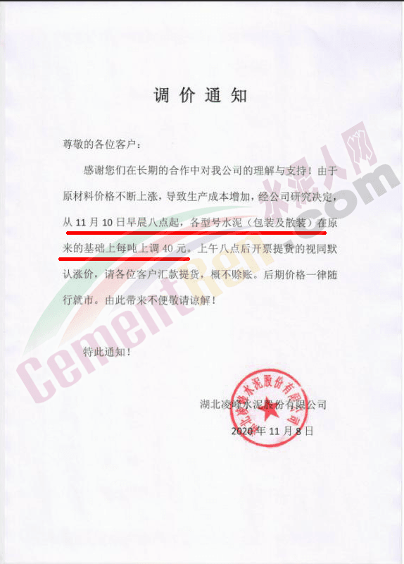 伊通滿族自治縣主要品牌企業(yè)通知下游商砼客戶稱,受道路交通限載及環(huán)保要求等因素影響,水泥原材料及運輸成本大幅上漲,尤其入冬以來煤炭成本漲幅巨大,導致水泥生產(chǎn)成本增加,為公司正常生產(chǎn)經(jīng)營帶來壓力。為緩解生產(chǎn)經(jīng)營成本壓力,保證公司正常運營及出廠水泥質量,經(jīng)公司研究決定上調PO2.5裝水泥出廠價160元/噸,運費同步上調20元/噸。
