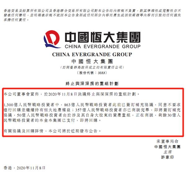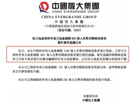 此前在9月24日,網(wǎng)上流傳出一份恒大集團(tuán)的文件,稱若無法按時回A,中國恒大的資金鏈可能斷裂,“可能引發(fā)一系列系統(tǒng)性風(fēng)險”,因此請求政府施以援手。雖然中國恒大隨后否認(rèn)該文件的真實性,但這份文件依然使恒大連續(xù)兩日上演“股債雙殺”,中國恒大的資金狀況備受關(guān)注。不過在今年的9月29日,恒大地產(chǎn)與1300億戰(zhàn)投中的863億戰(zhàn)投簽訂補(bǔ)充協(xié)議,戰(zhàn)投同意轉(zhuǎn)為普通股權(quán)長期持有,且股權(quán)比例保持不變。同時,恒大集團(tuán)還透露已與持有恒大地產(chǎn)總額155億人民幣的戰(zhàn)略投資者商談完畢,該戰(zhàn)略投資者正在辦理審批手續(xù)。正與剩余持有恒大地產(chǎn)總額282億人民幣的戰(zhàn)略投資者進(jìn)行商談。