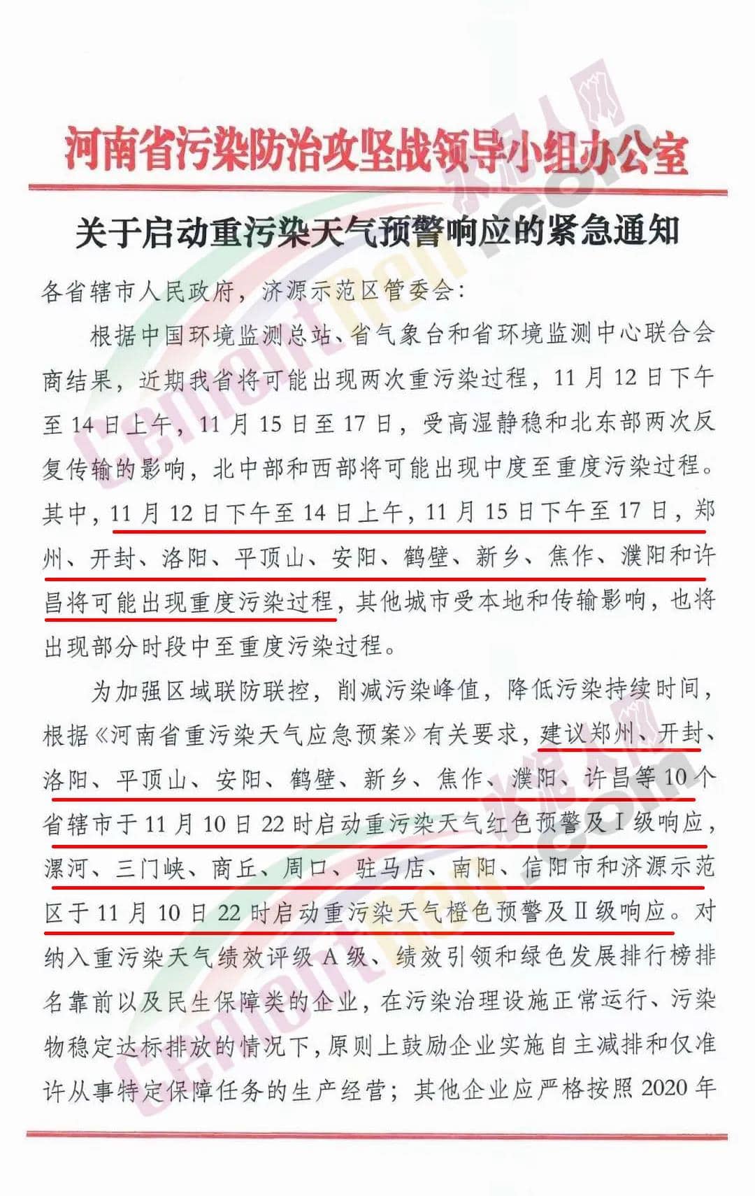 鄭州、開封、 洛陽(yáng)、平頂山、安陽(yáng)、鶴壁、新鄉(xiāng)、焦作、濮陽(yáng)、許昌等10個(gè)省轄市于11月10日22時(shí)啟動(dòng)重污染天氣紅色預(yù)警及I級(jí)響應(yīng)。漯河、三門峽、商丘、周口、駐馬店、南陽(yáng)、信陽(yáng)市和濟(jì)源示范區(qū)于11月10日22時(shí)啟動(dòng)重污染天氣橙色預(yù)警及II級(jí)響應(yīng)。對(duì)納入重污染天氣績(jī)效評(píng)級(jí)A級(jí)、績(jī)效引領(lǐng)和綠色發(fā)展排行榜排 名靠前以及民生保障類的企業(yè),在污染治理設(shè)施正常運(yùn)行、污染物穩(wěn)定達(dá)標(biāo)排放的情況下,原則上鼓勵(lì)企業(yè)實(shí)施自主減排和僅準(zhǔn)許從事特定保障任務(wù)的生產(chǎn)經(jīng)營(yíng);其他企業(yè)應(yīng)嚴(yán)格按照2020年重污染天氣應(yīng)急減排清單實(shí)施相應(yīng)級(jí)別管控措施。應(yīng)急搶險(xiǎn)、重大民生工程和重點(diǎn)項(xiàng)目,在嚴(yán)格落實(shí)“六個(gè)百分之百”施工要求 的前提下,可正常施工。 重污染天氣預(yù)警期間,請(qǐng)各地重點(diǎn)加強(qiáng)對(duì)城市建成區(qū)及周邊排污企業(yè)的管控力度,對(duì)應(yīng)停未停、應(yīng)限不限、預(yù)警前故意抬高排放量及用電量,或借“出于安全考慮無(wú)法停下來(lái)” “設(shè)備調(diào)試、 檢修”名義規(guī)避管控的企業(yè)依法依規(guī)嚴(yán)格處理。各地要主動(dòng)對(duì)社會(huì)發(fā)聲,提醒公眾做好健康防護(hù)措施,倡導(dǎo)公眾低碳生活、綠色消費(fèi),單位和公眾盡量減少含揮發(fā)性有機(jī)物的涂料、油漆、溶劑 等原材料和產(chǎn)品的使用,自覺接受社會(huì)監(jiān)督,同心協(xié)力做好重污 染天氣應(yīng)急應(yīng)對(duì)工作。通知原文如下: