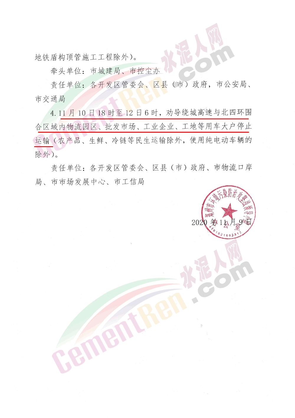 3. 繞城髙速與北四環(huán)圍合區(qū)域內(nèi)及滎陽(yáng)市,11月9日20時(shí)至13日24時(shí)停止商砼罐車運(yùn)輸;11月9日20時(shí)至12日12時(shí),工地及混凝土攪拌站停止物料車運(yùn)輸。4