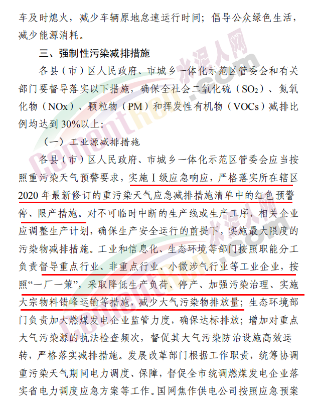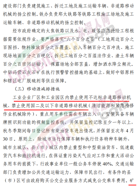 焦作市污染防治攻堅(jiān)戰(zhàn)領(lǐng)導(dǎo)小組辦公室發(fā)布《關(guān)于發(fā)布重污染天氣應(yīng)急預(yù)案紅色(Ⅰ級(jí))預(yù)警的緊急通知》稱,根據(jù)省污染防治攻堅(jiān)辦建議,經(jīng)焦作市污染防治攻堅(jiān)辦研究決定,自 2020 年 11 月 10 日 22 時(shí)起,發(fā)布重污染天氣應(yīng)急預(yù)案紅色(Ⅰ級(jí))預(yù)警,解除時(shí)間另行通知。各縣(市、區(qū))政府、 管委會(huì)及市有關(guān)部門要立即采取應(yīng)急減排措施。工業(yè)源減排措施方面要求各縣(市)區(qū)人民政府、市城鄉(xiāng)一體化示范區(qū)管委會(huì)應(yīng)當(dāng)按 照重污染天氣預(yù)警要求,實(shí)施Ⅰ級(jí)應(yīng)急響應(yīng),嚴(yán)格落實(shí)所在轄區(qū)2020 年最新修訂的重污染天氣應(yīng)急減排措施清單中的紅色預(yù)警停、限產(chǎn)措施。不可臨時(shí)中斷的生產(chǎn)線或生產(chǎn)工序,相關(guān)企業(yè)應(yīng)調(diào)整生產(chǎn)計(jì)劃,確保生產(chǎn)安全運(yùn)行的前提下,實(shí)施最大限度的污染物減排措施。預(yù)警期間,嚴(yán)禁工業(yè)企業(yè)新開生產(chǎn)線或運(yùn)行新的生產(chǎn)設(shè)備, 對(duì)于重污染天氣績(jī)效評(píng)級(jí) A 級(jí)、績(jī)效引領(lǐng)、民生保障等企業(yè), 原則上鼓勵(lì)企業(yè)自主減排和僅準(zhǔn)許特定保障任務(wù)的生產(chǎn)經(jīng)營(yíng)。長(zhǎng)期停產(chǎn)及未建成企業(yè)復(fù)產(chǎn)或試生產(chǎn)前,須向縣(區(qū))、市兩級(jí)污染防治攻堅(jiān)辦報(bào)告,經(jīng)同意后方可進(jìn)行。揚(yáng)塵源減排措施方面要求礦山、砂石料廠、石材廠、石板廠等應(yīng)停止露天作業(yè);施工工地停止室外作業(yè)。建筑垃圾清運(yùn)車輛和砂石運(yùn)輸車輛禁止上路行駛。開挖土石方的挖掘機(jī)等非道路移動(dòng)機(jī)械停止作業(yè)。施工工地內(nèi)停止使用國(guó)二及以下非道路移動(dòng)機(jī)械。移動(dòng)源減排措施要求工業(yè)企業(yè)廠區(qū)和工業(yè)園區(qū)內(nèi)禁止使用不達(dá)標(biāo)非道路移動(dòng)機(jī)械、禁止使用國(guó)二及以下非道路移動(dòng)機(jī)械,重點(diǎn)用車單位需在車輛出入口,安裝具備車輛牌照識(shí)別功能的視頻監(jiān)控系統(tǒng),并保留監(jiān)控記錄至少一年以上, 秋冬季期間每日登記所有柴油貨車進(jìn)出情況,并保留至次年4月30日。礦山(含煤礦)、洗煤廠、港口碼頭、物流等涉及大宗原料和產(chǎn)品運(yùn)輸?shù)膯挝粦?yīng)停止使用國(guó)四及以下重型載貨汽車(含燃?xì)?進(jìn)行運(yùn)輸。本輪預(yù)警期間,若企業(yè)、工地等正在執(zhí)行的污染管控措施嚴(yán)于紅色預(yù)警應(yīng)急減排措施的,執(zhí)行原污染管控措施,不得放松管控要求。