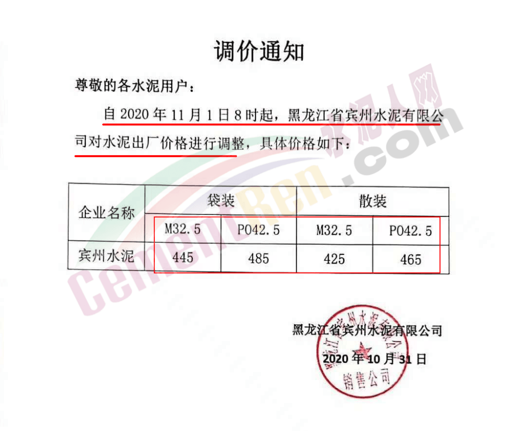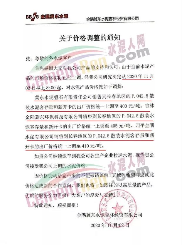 據(jù)水泥人網(wǎng)此前報(bào)道,近期多區(qū)域通知上調(diào)水泥價(jià)格,東北吉林某企業(yè)通知水泥價(jià)格一次性上調(diào)160元/噸,黑龍江主要品牌企業(yè)北方水泥、亞泰水泥一次性上調(diào)130~150元/噸。