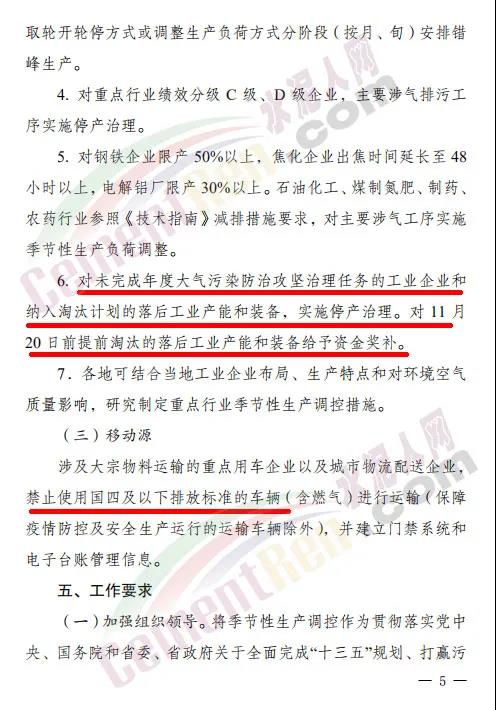 4.對未完成年度大氣污染防治攻堅治理任務(wù)的工業(yè)企業(yè)和納入淘汰計劃的落后工業(yè)產(chǎn)能和裝備,實施停產(chǎn)治理。對 11 月20 日前提前淘汰的落后工業(yè)產(chǎn)能和裝備給予資金獎補。