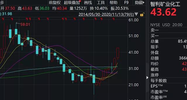 天眼查顯示,SQM是美股上市公司,主要開(kāi)發(fā)的智利阿塔卡瑪鹽湖擁有世界上最大的鹵水儲(chǔ)量,是運(yùn)營(yíng)中最高品位的鹵水資源。股價(jià)歷史最高報(bào)59.01美元,天齊鋰業(yè)的收購(gòu)價(jià)格較該股價(jià)有一定溢價(jià)。