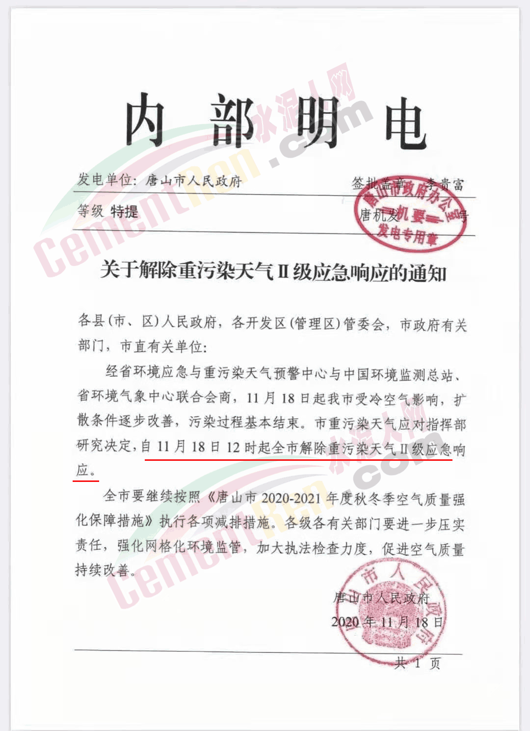關(guān)于解除重污染天氣Ⅱ級(jí)響應(yīng)的通知