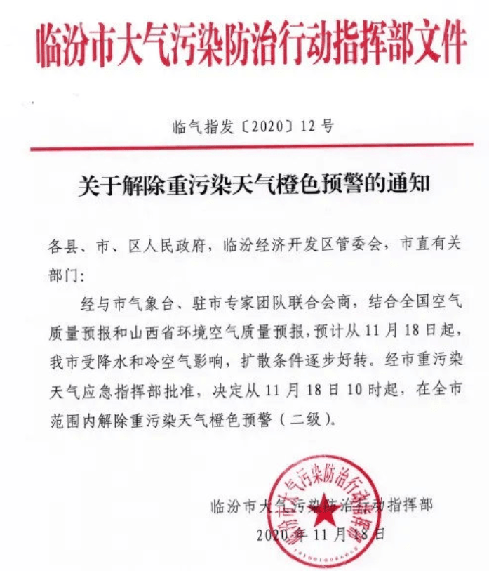 關(guān)于解除我市重污染天氣預(yù)警響應(yīng)的通知