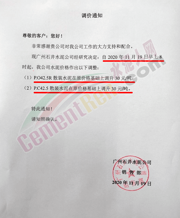 廣東鴻豐水泥通知自今日(19日)0時起,上調(diào)各標號散裝水泥報價30元/噸。