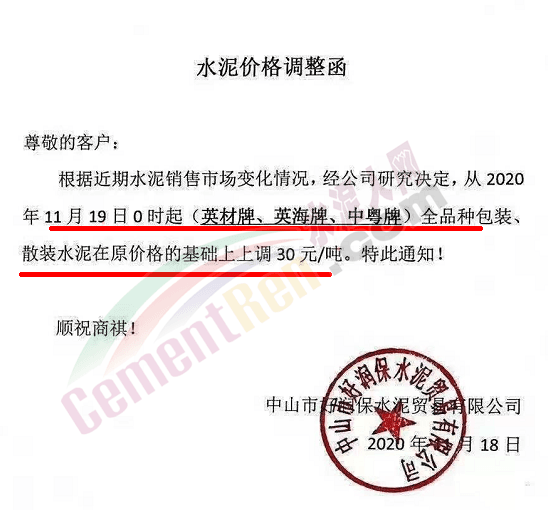 金圓水泥通知,11月19日0時各品種散裝水泥上調(diào)30元/噸,本月14日,金圓水泥還曾上調(diào)全品種袋裝水泥20元/噸。