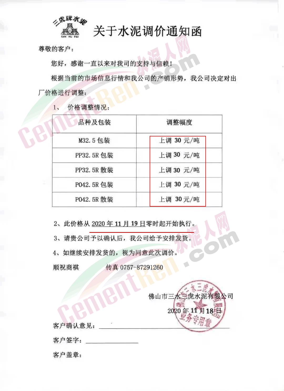佛山市三水三虎水泥通知自今日(19日)零時起各標號水泥上調(diào)30元/噸。