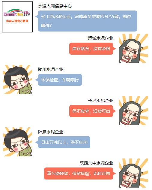 河南新鄉(xiāng)某企業(yè)求助水泥人網(wǎng)信息中心,希望能夠?qū)由轿魉嗥髽I(yè)。山西運城某企業(yè)負責(zé)對水泥人網(wǎng)表示,”庫存告急,沒有余糧”。陵川水泥企業(yè)回復(fù)環(huán)保檢查車輛禁行。山西陽泉區(qū)域回復(fù)日出萬噸以上,供不應(yīng)求,沒有庫存,產(chǎn)多少銷多少,還有排隊車等候。陜西關(guān)中水泥企業(yè)回復(fù),重污染天氣,停窯停磨,無料可供... ...