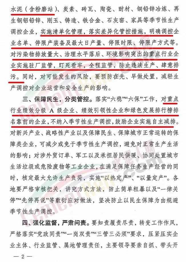 2.對(duì)新興產(chǎn)業(yè)、戰(zhàn)略性產(chǎn)業(yè)、重大工程項(xiàng)目、涉外貿(mào)訂單、 軍工以及承擔(dān)居民供暖、協(xié)同處置城市生活垃圾或危險(xiǎn)廢物等民生保障類企業(yè),生產(chǎn)調(diào)控期間僅準(zhǔn)許從事保障任務(wù)的生產(chǎn)經(jīng)營(yíng)。