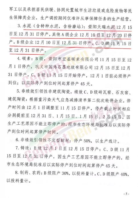3.水泥(含特種水泥,含粉磨站):滎陽(yáng)天瑞水泥12月15 日至12月31日停產(chǎn),其他A級(jí)企業(yè)12月10日至12月20日停產(chǎn)。B級(jí)企業(yè)12月10日至12月31日停產(chǎn)。C、D級(jí)11月15日 至12月31日停產(chǎn)。