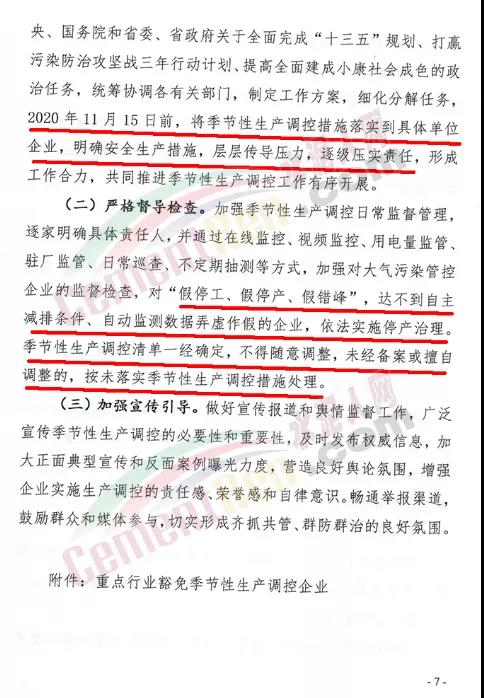 嚴(yán)格督導(dǎo)檢查。加強(qiáng)季節(jié)性生產(chǎn)調(diào)控日常監(jiān)督管理, 逐家明確具體責(zé)任人,并通過(guò)在線監(jiān)控、視頻監(jiān)控、用電量監(jiān)管、 駐廠監(jiān)管、日常巡查、不定期抽測(cè)等方式,加強(qiáng)對(duì)大氣污染管控 企業(yè)的監(jiān)督檢查,對(duì)“假停工、假停產(chǎn)、假錯(cuò)峰”,達(dá)不到自主減排條件、自動(dòng)監(jiān)測(cè)數(shù)據(jù)弄虛作假的企業(yè),依法實(shí)施停產(chǎn)治理。季節(jié)性生產(chǎn)調(diào)控清單一經(jīng)確定,不得隨意調(diào)整,未經(jīng)備案或擅自調(diào)整的,按未落實(shí)季節(jié)性生產(chǎn)調(diào)控措施處理。重點(diǎn)行業(yè)豁免季節(jié)性生產(chǎn)調(diào)控企業(yè)名單列表中20家企業(yè)不包括水泥行業(yè)。 通知全文如下: