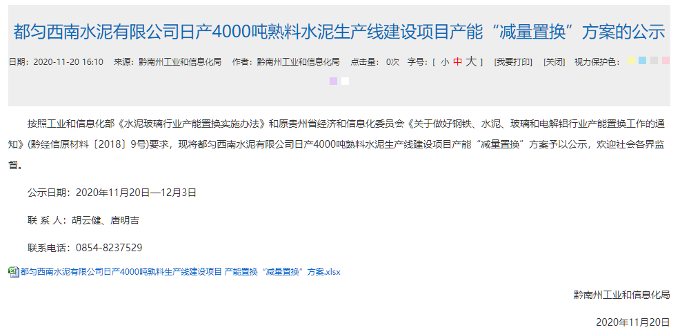 日前,貴州省黔南布依族苗族自治州工業(yè)和信息化局官網(wǎng)發(fā)布《都勻西南水泥有限公司日產(chǎn)4000噸熟料水泥生產(chǎn)線建設(shè)項(xiàng)目產(chǎn)能“減量置換”方案的公示》 。公示顯示,都勻西南水泥有限公司將通過(guò)退出貴州中誠(chéng)水泥有限公司和貴州三都西南水泥有限公司兩條2500t/d熟料生產(chǎn)線,新建一條4000t/d新型干法熟料生產(chǎn)線。
