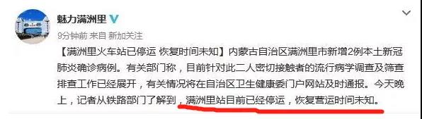 內(nèi)蒙古滿洲里市所有人員核酸檢測(cè),火車停運(yùn)、學(xué)校停課、公共場(chǎng)所暫停營(yíng)業(yè)!