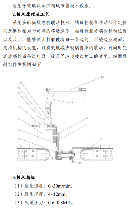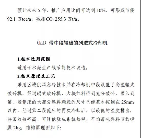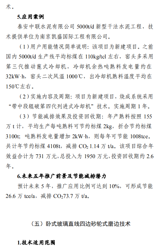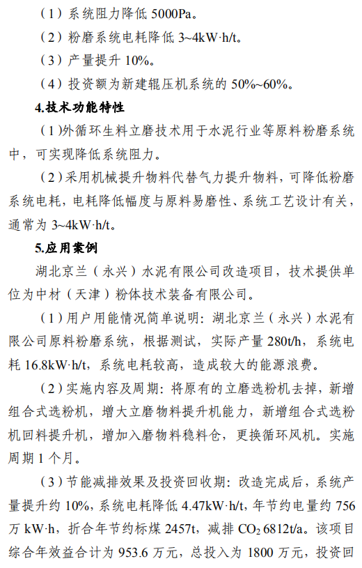 之一:建材行業(yè)節(jié)能改造技術(shù)外循環(huán)生料立磨節(jié)能技術(shù),采用外循環(huán)立磨系統(tǒng)工藝,將立磨的研磨和分選功能分開(kāi),系統(tǒng)氣體阻力降低5000Pa,通風(fēng)能耗和電耗降低,粉磨系統(tǒng)電耗降低3-4kW·h/t,能源利用效率大幅提升。在湖北京蘭(永興)水泥有限公司改造項(xiàng)目中,系統(tǒng)產(chǎn)量提升約10%,系統(tǒng)電耗降低4.47kW·h/t,年節(jié)約電量約756萬(wàn)kW·h,折合年節(jié)約標(biāo)煤2457t,減排二氧化碳6812t/a。鋼渣/礦渣輥壓機(jī)終粉磨系統(tǒng)節(jié)能技術(shù),以輥壓機(jī)和動(dòng)靜組合式選粉機(jī)為核心設(shè)備,輥面壽命可達(dá)立磨的2倍,具有廣泛的物料適應(yīng)性;全部物料為外循環(huán),除鐵方便,避免塊狀金屬富集;系統(tǒng)阻力低,節(jié)電效果明顯,礦渣微粉生產(chǎn)的系統(tǒng)電耗<35kW·h/t。在邯鄲市邦信建材有限公司礦渣粉磨及儲(chǔ)存(30萬(wàn)t/a)項(xiàng)目中,鋼渣/礦渣輥壓機(jī)終粉磨系統(tǒng)年節(jié)約電量約120萬(wàn)kW·h,折合年節(jié)約標(biāo)煤390t,減排二氧化碳1081t/a。陶瓷原料連續(xù)制漿系統(tǒng)節(jié)能技術(shù),采用自動(dòng)精確連續(xù)配料、原料預(yù)處理系統(tǒng)、泥料/黏土連續(xù)化漿系統(tǒng)、連續(xù)式球磨方法等關(guān)鍵技術(shù),實(shí)現(xiàn)自動(dòng)配料和自動(dòng)出漿的功能,原料預(yù)處理系統(tǒng)綜合能耗≤4kW·h/t,250目篩余0.7%-0.9%、料漿產(chǎn)能85-100t/h連續(xù)球磨系統(tǒng)綜合能耗≤30kW·h/t,泥料化漿系統(tǒng)綜合能耗≤1.2kW·h/t,節(jié)能效果顯著。山東名宇陶瓷科技有限公司陶瓷原料節(jié)能連續(xù)制漿系統(tǒng)改造項(xiàng)目,生產(chǎn)線年節(jié)約總電量約309.54萬(wàn)kW·h,折合年節(jié)約標(biāo)煤1006t,減排二氧化碳2789t/a。帶中段輥破的列進(jìn)式冷卻機(jī)節(jié)能技術(shù),采用區(qū)域供風(fēng)急冷技術(shù)并在冷卻機(jī)中段設(shè)置了高溫輥式破碎機(jī),使大塊紅料得到充分破碎,落入到第二段篦床冷卻后,以較低的溫度排出,熱回收效率高,可降低燒成系統(tǒng)熱耗,平均每噸熟料節(jié)約標(biāo)煤2kg。在泰安中聯(lián)水泥有限公司5000t/d新型干法水泥工程項(xiàng)目中,系統(tǒng)運(yùn)行穩(wěn)定,年節(jié)約標(biāo)煤4108t,減排二氧化碳1.14萬(wàn)t/a。臥式玻璃直線四邊砂輪式磨邊技術(shù),采用多軸伺服電機(jī)聯(lián)動(dòng)技術(shù),精確控制各移動(dòng)部件定位以及磨輪相對(duì)于玻璃的移動(dòng)速度,磨邊速度15-30m/min,玻璃所需磨邊時(shí)間平均20s/m2,可同時(shí)完成玻璃的四條邊打磨,提升了玻璃棱邊加工的效率。在廣宇洛玻(北京)工業(yè)玻璃有限公司改造項(xiàng)目中,該項(xiàng)目年節(jié)約標(biāo)煤46.8t,減排二氧化碳1170t/a。新型水泥熟料冷卻技術(shù)及裝備,采用新型前吹高效篦板、高效急冷斜坡、高溫區(qū)細(xì)分供風(fēng)、新型高溫耐磨材料、智能化“自動(dòng)駕駛”、新型流量調(diào)節(jié)閥等技術(shù),熱回收效率高、輸送運(yùn)轉(zhuǎn)率高、磨損低。在淶水冀東水泥有限公司篦冷機(jī)改造項(xiàng)目中,噸熟料工序電耗下降2.57kW·h,每年可節(jié)電370萬(wàn)kW·h,折合標(biāo)煤1202.5t,工序標(biāo)煤耗下降2.81kg/tcl,每年可節(jié)約5100tce,余熱發(fā)電年增加發(fā)電量570萬(wàn)kW·h,折合標(biāo)煤1852.5t。綜合年節(jié)約標(biāo)煤8155t,減排二氧化碳2.26萬(wàn)t/a。