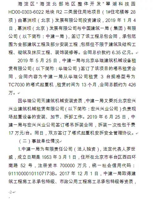 海淀區(qū)“海淀北部地區(qū)整體開(kāi)發(fā)”翠湖科技園HD00-0303-6022地塊R2二類(lèi)居住用地項(xiàng)目(1#住宅樓等28項(xiàng))由葛洲壩北京投資建設(shè)。2019年1月4日,葛洲壩北京與中國(guó)建筑一局(集團(tuán))有限公司(以下簡(jiǎn)稱(chēng):“中建一局”),簽訂了上述事故工程的總包合同,承包范圍為全部建筑工程及部分安裝工程,包括但不限于建筑及結(jié)構(gòu)工程、砌筑及抹灰工程、裝飾裝修等。合同總價(jià)款約6.35億元。