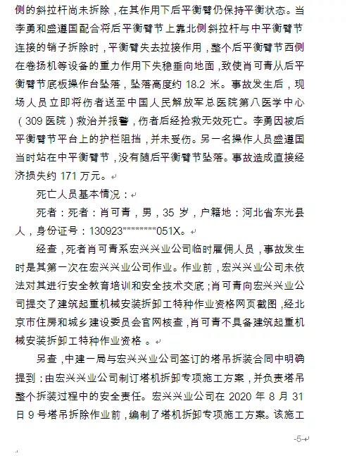 當(dāng)李某和盛某配合將后平衡臂節(jié)上靠北側(cè)斜拉桿與中平衡臂節(jié)連接的銷(xiāo)子拆除時(shí),平衡臂失去拉接作用,整個(gè)后平衡臂節(jié)西側(cè)在卷?yè)P(yáng)機(jī)等設(shè)備的重力作用下失穩(wěn)垂向地面,致使肖某從后平衡臂節(jié)底板操作臺(tái)墜落,墜落高度約18.2 米。事故發(fā)生后,現(xiàn)場(chǎng)人員立即將傷者送至中國(guó)人民解放軍總醫(yī)院第八醫(yī)學(xué)中心(309醫(yī)院)救治并報(bào)警,傷者后經(jīng)搶救無(wú)效死亡。李某因被后平衡臂節(jié)平臺(tái)上的護(hù)欄阻擋,并未受傷。另一名操作人員盛某當(dāng)時(shí)站在中平衡臂節(jié),沒(méi)有隨后平衡臂節(jié)墜落。”