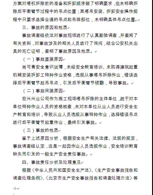 事故報(bào)告顯示,事故直接原因?yàn)樾つ嘲踩庾R(shí)淡薄,未經(jīng)安全教育培訓(xùn)、未取得建筑起重機(jī)械安裝拆卸工特種作業(yè)資格,違規(guī)從事塔吊拆除作業(yè),錯(cuò)誤選擇后平衡臂節(jié)起吊吊點(diǎn),引發(fā)后平衡臂節(jié)傾翻,導(dǎo)致事故。