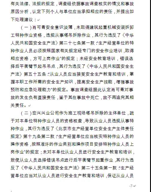事故調(diào)查組建議區(qū)應(yīng)急管理局責(zé)成宏興興業(yè)公司深刻吸取事故教訓(xùn),依法落實(shí)對(duì)特種作業(yè)人員操作資格的依法審核;加強(qiáng)對(duì)現(xiàn)場(chǎng)作業(yè)人員的安全培訓(xùn)教育;進(jìn)一步完善塔吊拆除方案及安全操作規(guī)程,明確后平衡臂節(jié)拆除過(guò)程中所選起重吊點(diǎn)的具體位置,并做好書(shū)面技術(shù)交底,確保從業(yè)人員具備安全作業(yè)所需的知識(shí)和技能,避免類(lèi)似事故再次發(fā)生。