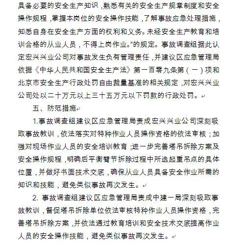事故調(diào)查組建議區(qū)應(yīng)急管理局責(zé)成中建一局深刻吸取事故教訓(xùn),督促塔吊拆除單位依法審核特種作業(yè)人員操作資格,完善塔吊拆除方案,并依法通過(guò)教育培訓(xùn)和安全技術(shù)交底提高作業(yè)人員的安全操作技能,避免類(lèi)似事故再次發(fā)生。
