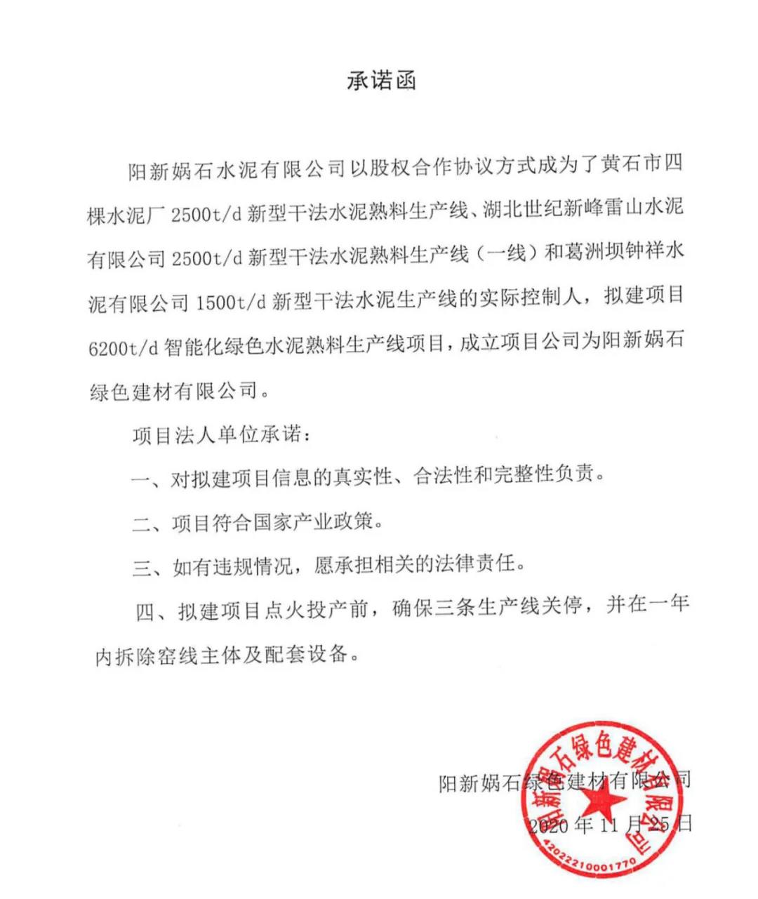 陽新媧石綠色建材有限公司水泥熟料生產線產能減量遷建方案
