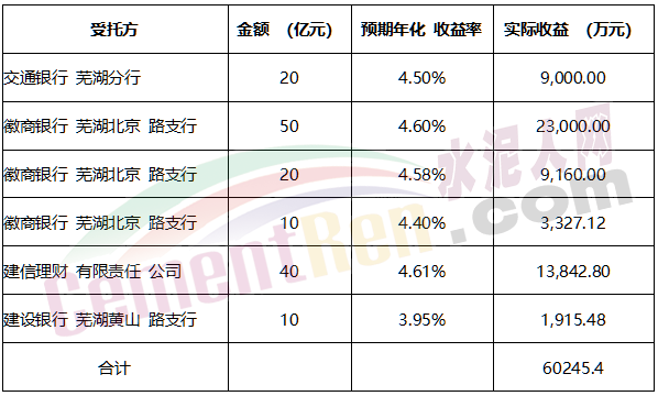 據(jù)水泥人網(wǎng)了解,海螺水泥有大量的現(xiàn)金流,這也是海螺水泥敢于四處擴(kuò)建的最大優(yōu)勢(shì),根據(jù)海螺水泥2020年中報(bào)數(shù)據(jù)顯示,通過(guò)理財(cái)海螺水泥的實(shí)際益就達(dá)到6億元,這是很多水泥企業(yè)辛苦一年的收益。海螺水泥2020年部分理財(cái)收益如表1所示: