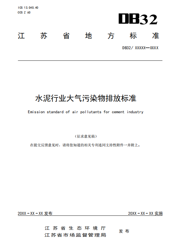 日前,江蘇省生態(tài)環(huán)境廳發(fā)布關(guān)于征求地方標(biāo)準(zhǔn)《水泥行業(yè)大氣污染物排放標(biāo)準(zhǔn)(征求意見(jiàn)稿)》意見(jiàn)的函稱(chēng),為貫徹《中華人民共和國(guó)環(huán)境保護(hù)法》、《中華人民共和國(guó)大氣污染防治法》、《江蘇省大氣污染防治條例》,加強(qiáng)大氣污染物排放控制,江蘇省生態(tài)環(huán)境廳組織起草了地方標(biāo)準(zhǔn)《水泥行業(yè)大氣污染物排放標(biāo)準(zhǔn)(征求意見(jiàn)稿)》。