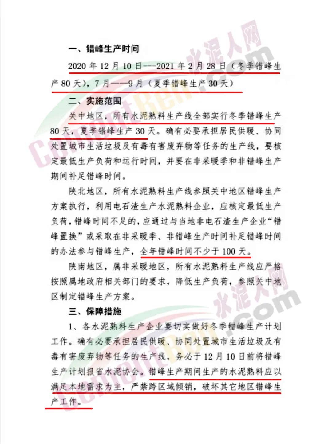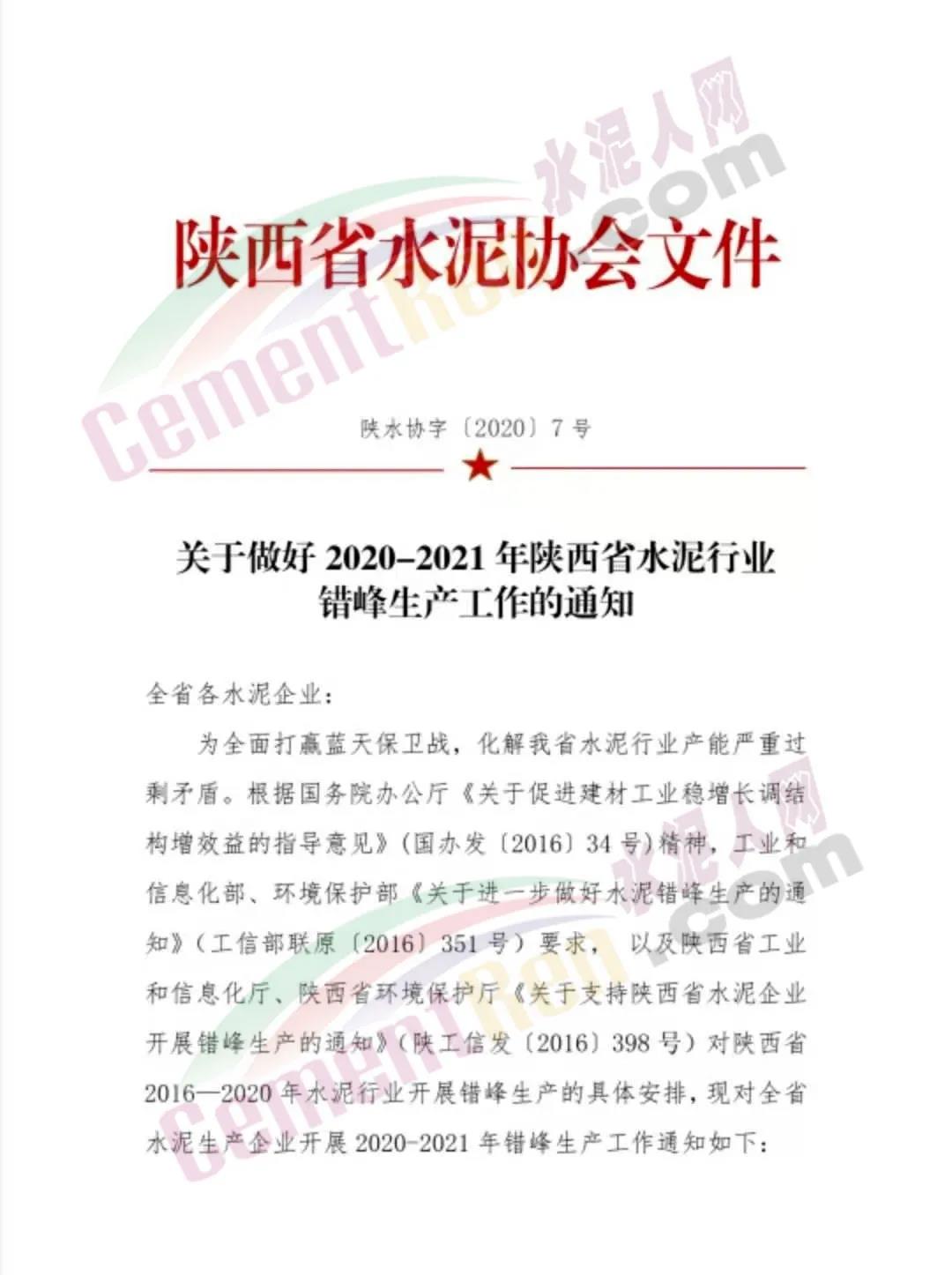 一、錯峰生產(chǎn)時間2020年12月10日—--2021年2月28日(冬季錯峰生產(chǎn)80天),7月——9月(夏季錯峰生產(chǎn)30天)二、實施范圍關(guān)中地區(qū),所有水泥熟料生產(chǎn)線全部實行冬季錯峰生產(chǎn)80天,夏季錯峰生產(chǎn)30天。確有必要承擔居民供暖、協(xié)同處置城市生活垃圾及有毒有害廢棄物等任務(wù)的生產(chǎn)線,要核定最低生產(chǎn)負荷和運行時間,并要在非采暖季和非錯峰生產(chǎn)期間補足錯峰時間。陜北地區(qū),所有水泥熟料生產(chǎn)線參照關(guān)中地區(qū)錯峰生產(chǎn)方案執(zhí)行,利用電石渣生產(chǎn)水泥熟料企業(yè),應(yīng)核定最低生產(chǎn)負荷,錯峰時間不足的,應(yīng)通過與當?shù)胤请娛a(chǎn)企業(yè)"錯峰置換"或采取在非采暖季、非錯峰生產(chǎn)時間補足錯峰時間的辦法參與錯峰生產(chǎn),全年錯峰時間不少于100天。陜南地區(qū),屬非采暖地區(qū),所有水泥熟料生產(chǎn)線應(yīng)嚴格按照屬地政府相關(guān)部門的要求,降低生產(chǎn)負荷,參照關(guān)中地區(qū)制定錯峰生產(chǎn)方案。三、保障措施1、各水泥熟料生產(chǎn)企業(yè)要切實做好冬季錯峰生產(chǎn)計劃工作。確有必要承擔居民供暖、協(xié)同處置城市生活垃圾及有毒有害廢棄物等任務(wù)的生產(chǎn)線,務(wù)必于12月10日前將錯峰生產(chǎn)計劃報省水泥協(xié)會。錯峰生產(chǎn)期間生產(chǎn)的水泥熟料應(yīng)以滿足本地需求為主,嚴禁跨區(qū)域傾銷,破壞其它地區(qū)錯峰生產(chǎn)工作。2、錯峰生產(chǎn)期間,若遇到嚴重污染天氣時,水泥熟料生產(chǎn)企業(yè)應(yīng)按照屬地政府相關(guān)部門的要求,嚴格落實各項減排措施,減少污染物排放,做好停產(chǎn)應(yīng)急響應(yīng)工作,其原生產(chǎn)計劃不再變更。鼓勵全省所有水泥企業(yè)結(jié)合當?shù)貙嶋H情況,在春節(jié)、酷暑伏天、雨季和重大活動期間主動開展錯峰生產(chǎn)。3、省水泥協(xié)會將匯總省內(nèi)各水泥企業(yè)錯峰生產(chǎn)計劃,分別報省、市(區(qū))工信和生態(tài)環(huán)境部門備案,并牽頭組織自律成員單位檢查錯峰生產(chǎn)計劃執(zhí)行情況,對不參與或開展錯峰生產(chǎn)不力的企業(yè),將予以通報。省水泥協(xié)會按進度對錯峰生產(chǎn)工作進行總結(jié),并將執(zhí)行情況向行業(yè)主管部門報告。通知原文如下: