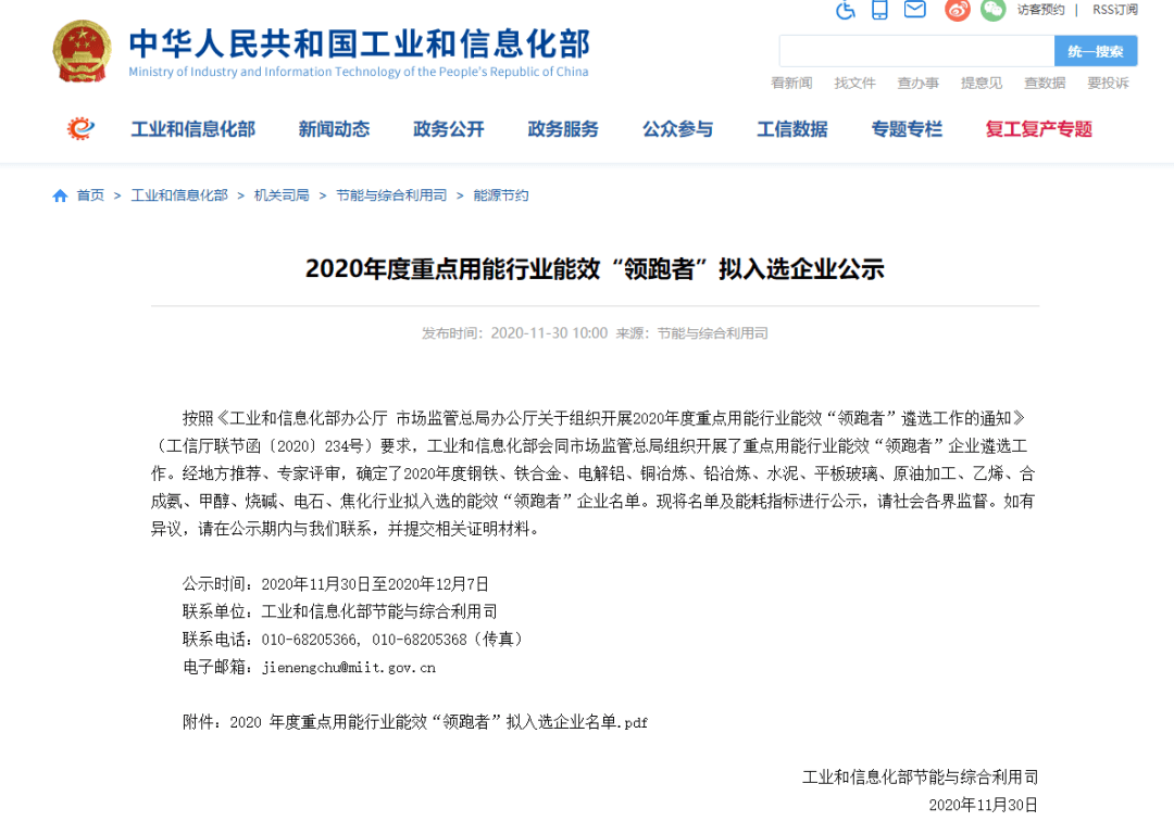 日前,工信部發(fā)布《2020年度重點用能行業(yè)能效“領(lǐng)跑者”擬入選企業(yè)公示》稱,按照《工業(yè)和信息化部辦公廳 市場監(jiān)管總局辦公廳關(guān)于組織開展2020年度重點用能行業(yè)能效“領(lǐng)跑者”遴選工作的通知》(工信廳聯(lián)節(jié)函〔2020〕234號)要求,工業(yè)和信息化部會同市場監(jiān)管總局組織開展了重點用能行業(yè)能效“領(lǐng)跑者”企業(yè)遴選工作。經(jīng)地方推薦、專家評審,確定了2020年度鋼鐵、鐵合金、電解鋁、銅冶煉、鉛冶煉、水泥、平板玻璃、原油加工、乙烯、合成氨、甲醇、燒堿、電石、焦化行業(yè)擬入選的能效“領(lǐng)跑者”企業(yè)名單?,F(xiàn)將名單及能耗指標進行公示,請社會各界監(jiān)督。如有異議,請在公示期內(nèi)與我們聯(lián)系,并提交相關(guān)證明材料。