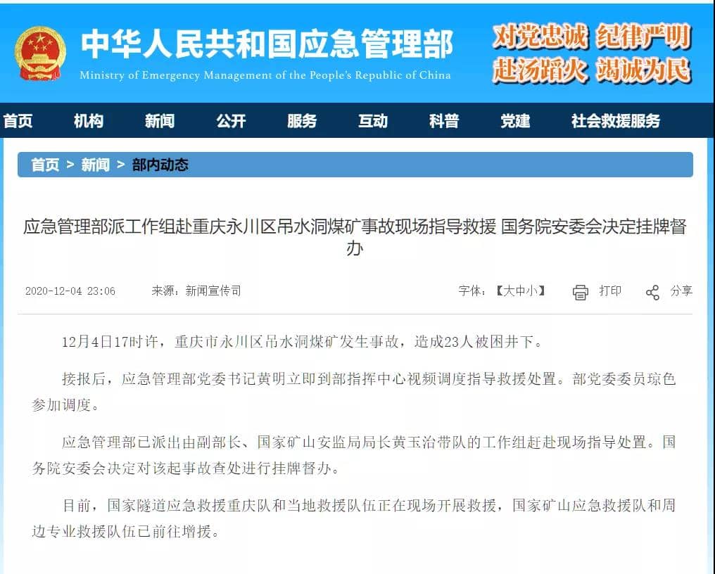 接報后,應急管理部黨委書記黃明立即到部指揮中心視頻調度指導救援處置。部黨委委員瓊色參加調度。應急管理部已派出由副部長、國家礦山安監(jiān)局局長黃玉治帶隊的工作組趕赴現(xiàn)場指導處置。國務院安委會決定對該起事故查處進行掛牌督辦。目前,國家隧道應急救援重慶隊和當?shù)鼐仍犖檎诂F(xiàn)場開展救援,國家礦山應急救援隊和周邊專業(yè)救援隊伍已前往增援。