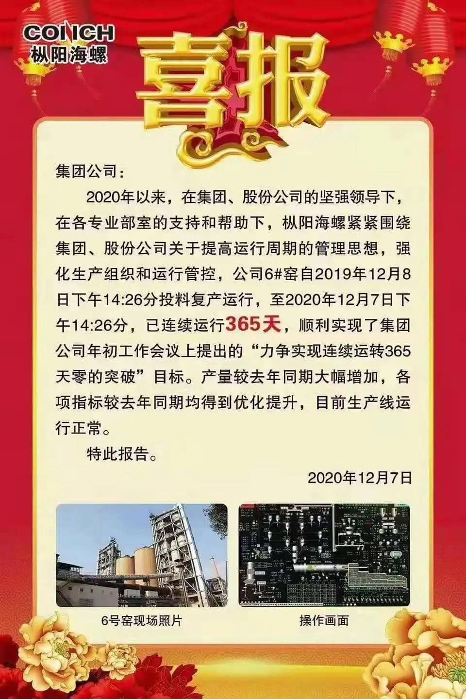 12月7日樅陽(yáng)海螺向集團(tuán)公司報(bào)喜稱,2020年以來(lái),在集團(tuán)、股份公司的堅(jiān)強(qiáng)領(lǐng)導(dǎo)下,在各專業(yè)部室的支持和幫助下,樅陽(yáng)海螺緊緊圍繞集團(tuán)、股份公司關(guān)于提高運(yùn)行周期的管理思想,強(qiáng)化生產(chǎn)組織和運(yùn)行管控,公司6#窯自2019年12月8日下午14∶26分投料復(fù)產(chǎn)運(yùn)行,至2020年12月7日下午14∶26分,已連續(xù)運(yùn)行365天,順利實(shí)現(xiàn)了集團(tuán)公司年初工作會(huì)議上提出的"力爭(zhēng)實(shí)現(xiàn)連續(xù)運(yùn)轉(zhuǎn)365天零的突破"目標(biāo)。產(chǎn)量較去年同期大幅增加,各項(xiàng)指標(biāo)較去年同期均得到優(yōu)化提升,目前生產(chǎn)線運(yùn)行正常。
