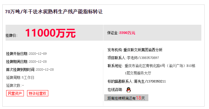 標(biāo)的系70萬(wàn)噸/年干法水泥熟料生產(chǎn)線產(chǎn)能指標(biāo),擬按現(xiàn)狀以不低于轉(zhuǎn)讓底價(jià)11000萬(wàn)元協(xié)議或競(jìng)價(jià)整體轉(zhuǎn)讓,標(biāo)的基本情況如下: