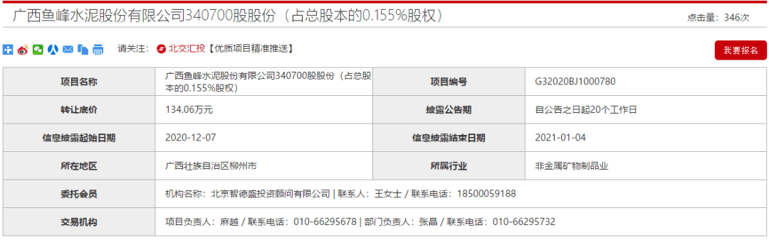 廣西魚峰水泥0.155%股份轉(zhuǎn)讓,底價(jià)為134.06萬(wàn)元