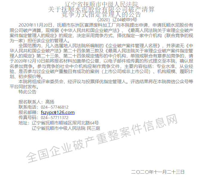 一、遼寧撫順?biāo)喙煞萦邢薰敬娈a(chǎn)清算競(jìng)爭(zhēng)方式指定管理人
