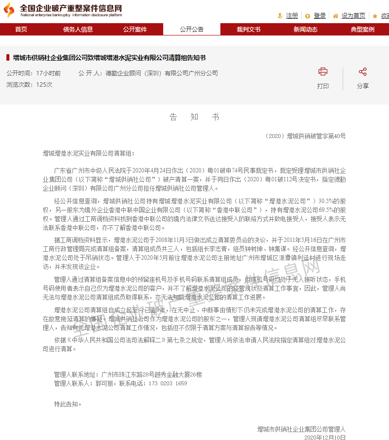 二、增城市供銷社企業(yè)集團(tuán)公司致增城增港水泥實(shí)業(yè)有限公司清算組告知書