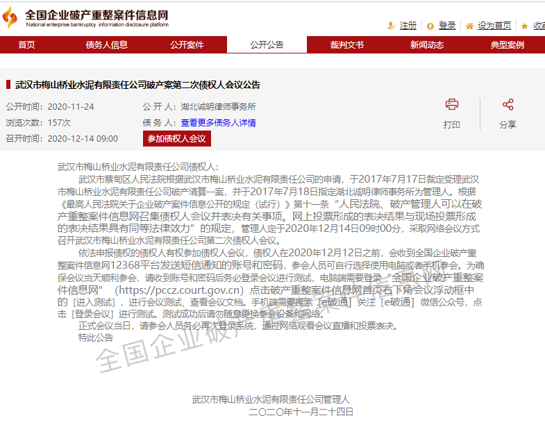 三、武漢市梅山橋業(yè)水泥有限責(zé)任公司破產(chǎn)案第二次債權(quán)人會(huì)議