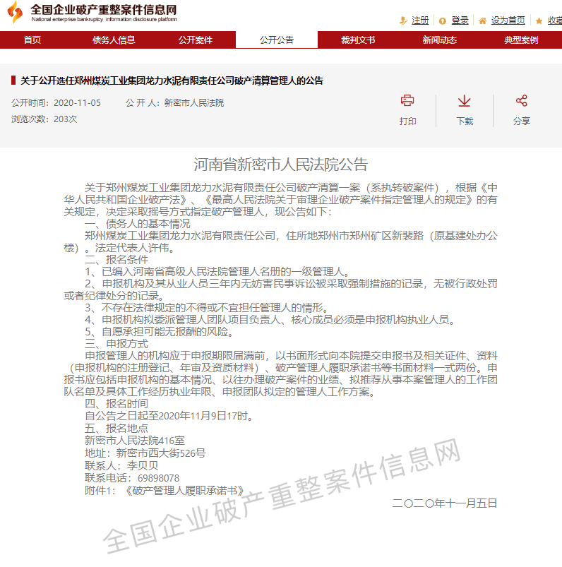 四、關(guān)于公開選任鄭州煤炭工業(yè)集團(tuán)龍力水泥有限責(zé)任公司破產(chǎn)清算管理人