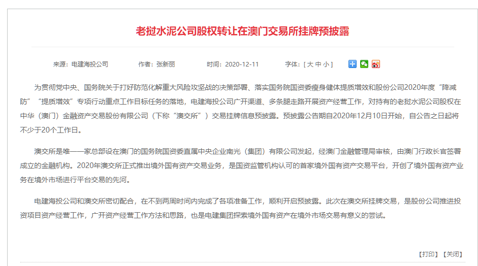 日前,中國(guó)電建官網(wǎng)發(fā)布消息稱,為防范化解重大風(fēng)險(xiǎn)攻堅(jiān)戰(zhàn)的決策部署、落實(shí)瘦身健體提質(zhì)增效和股份公司2020年度“降減防”“提質(zhì)增效”專項(xiàng)行動(dòng)重點(diǎn)工作目標(biāo)任務(wù)的落地,電建海投公司廣開渠道、多條腿走路開展資產(chǎn)經(jīng)營(yíng)工作,對(duì)持有的老撾水泥公司股權(quán)在中華(澳門)金融資產(chǎn)交易股份有限公司(下稱“澳交所”)交易掛牌信息預(yù)披露。預(yù)披露公告期自2020年12月10日開始,自公告之日起將不少于20個(gè)工作日。澳交所是唯一一家總部設(shè)在澳門的國(guó)務(wù)院國(guó)資委直屬中央企業(yè)南光(集團(tuán))有限公司發(fā)起,經(jīng)澳門金融管理局審核,由澳門行政長(zhǎng)官簽署成立的金融機(jī)構(gòu)。2020年澳交所正式推出境外國(guó)有資產(chǎn)交易業(yè)務(wù),是國(guó)資監(jiān)管機(jī)構(gòu)認(rèn)可的首家境外國(guó)有資產(chǎn)交易平臺(tái),開創(chuàng)了境外國(guó)有資產(chǎn)業(yè)務(wù)在境外市場(chǎng)進(jìn)行平臺(tái)交易的先河。